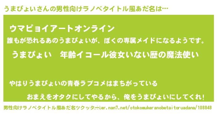 | 女子向けラノベタイトル風あだ名 | 『うまぴょいの玉の輿計画!』 |