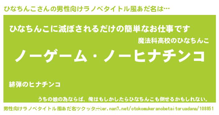 | 女子向けラノベタイトル風あだ名 | 『死神ひなちんこの再婚』 |