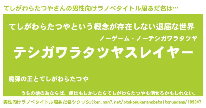 てしがわらたつやさんの男性向けラノベタイトル風あだ名をツクッター!
