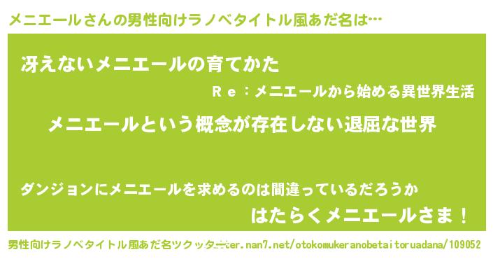 | 女子向けラノベタイトル風あだ名 | 『異世界で失敗しない100のメニエール』 |