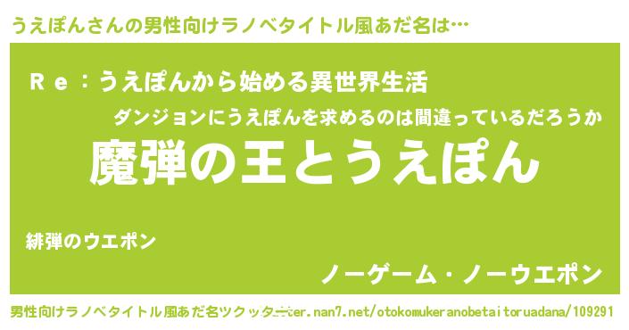 | 女子向けラノベタイトル風あだ名 | 『うえぽんが死なない童話 林檎のうえぽんの診療簿』 |
