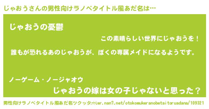 | 女子向けラノベタイトル風あだ名 | 『異世界でカフェじゃおうを開店しました。』 |