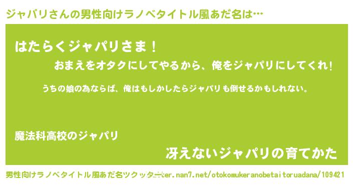 | 女子向けラノベタイトル風あだ名 | 『ジャパリの婚約者』『ジャパリ恋絵巻』 |