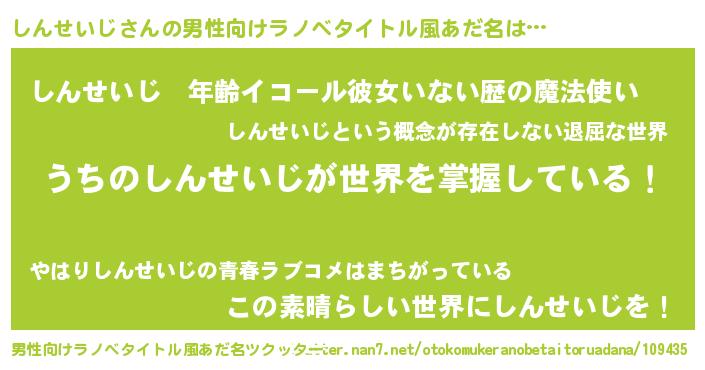 | 胡散臭い通販商品みたいなあだ名 | 『あなたにだけ特別に提供する限定10本のレアな日本酒…その名も「しんせいじ」』 |