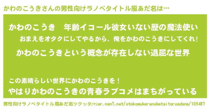 | 胡散臭い通販商品みたいなあだ名 | 『来世でも幸せになれる水素水…その名も「かわのこうき」』 |