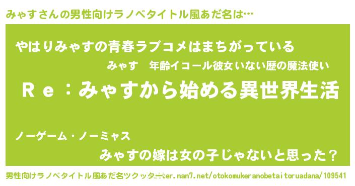 | 女子向けラノベタイトル風あだ名 | 『闇のみゃす』『みゃすの雑貨屋さん』 |
