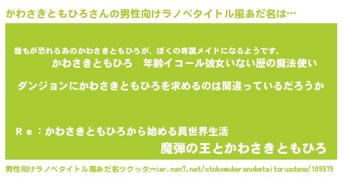 | 女子向けラノベタイトル風あだ名 | 『かわさきともひろの卵を拾いまして』 |