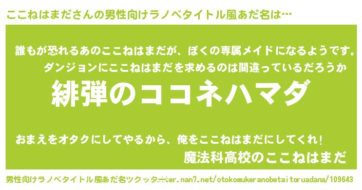 | 胡散臭い通販商品みたいなあだ名 | 『絶対に幸福をもたらす健康食品…その名も「ここねはまだ」』 |