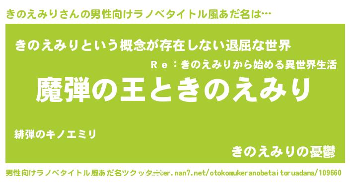 | 女子向けラノベタイトル風あだ名 | 『乙女ゲームの破滅フラグしかない悪役きのえみりに転生してしまった…』 |