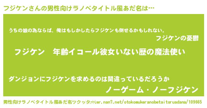 | 女子向けラノベタイトル風あだ名 | 『フジケンの玉の輿計画!』 |
