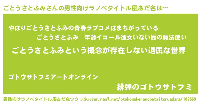 | 女子向けラノベタイトル風あだ名 | 『異世界で失敗しない100のごとうさとふみ』 |