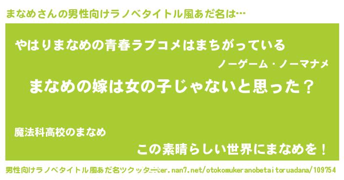 | 女子向けラノベタイトル風あだ名 | 『まなめの卵を拾いまして』 |