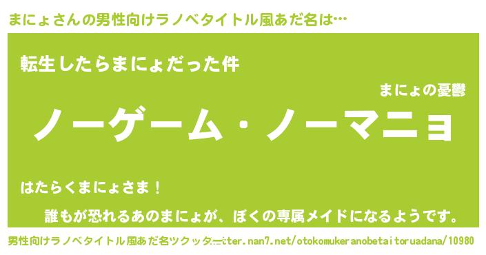 | 女子向けラノベタイトル風あだ名 | 『死神まにょの再婚』『まにょの契約王妃』 |