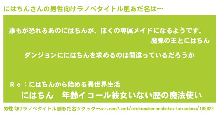 | 女子向けラノベタイトル風あだ名 | 『にはちんの卵を拾いまして』 |