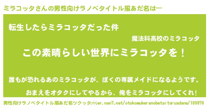 | 女子向けラノベタイトル風あだ名 | 『乙女ゲームの破滅フラグしかない悪役ミラコッタに転生してしまった…』 |