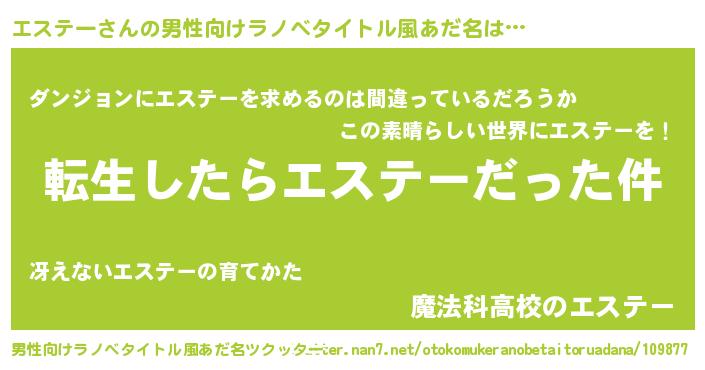 | 女子向けラノベタイトル風あだ名 | 『エステーの玉の輿計画!』 |