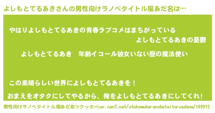 | 女子向けラノベタイトル風あだ名 | 『よしもとてるあきの玉の輿計画!』 |