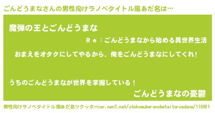 | 女子向けラノベタイトル風あだ名 | 『ごんどうまな夫妻のなれそめ』 |
