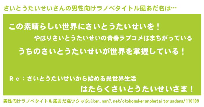 | 意味不明あだ名 | 『住所不定無職さいとうたいせい(13歳)』 |