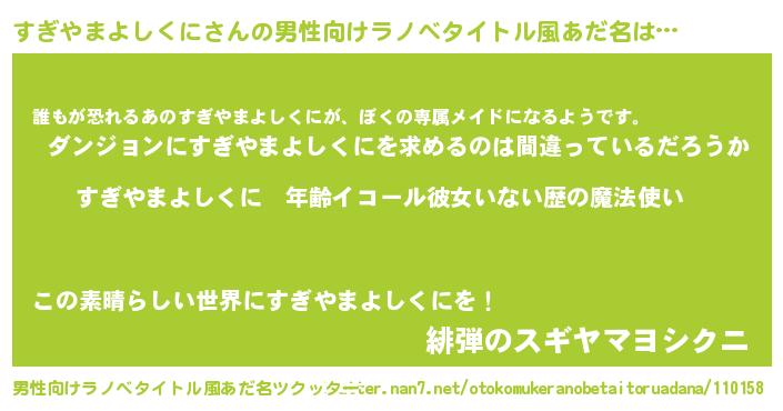 | 女子向けラノベタイトル風あだ名 | 『すぎやまよしくにの玉の輿計画!』 |