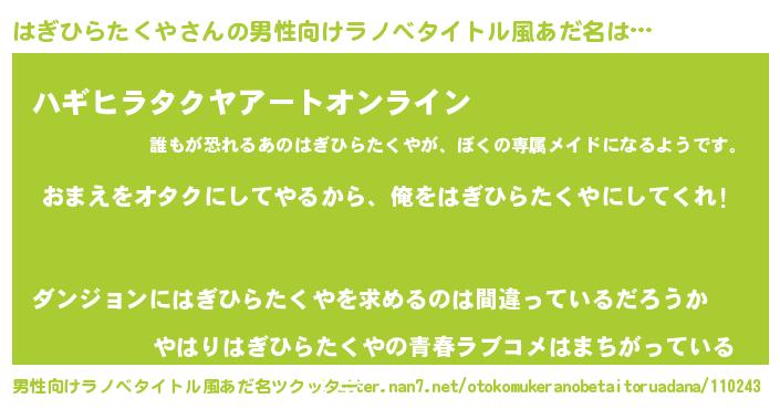 | 胡散臭い通販商品みたいなあだ名 | 『100人中100人が認めたマグネット磁石…その名も「はぎひらたくや」』 |