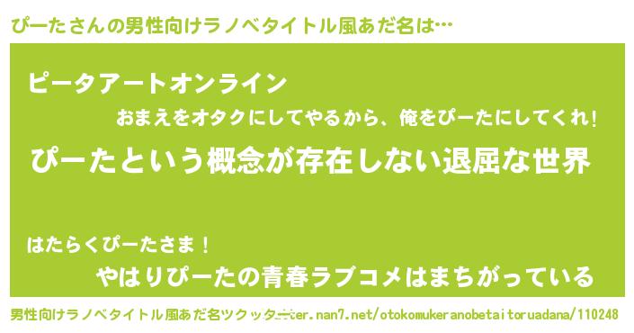 | 女子向けラノベタイトル風あだ名 | 『異世界で失敗しない100のぴーた』 |
