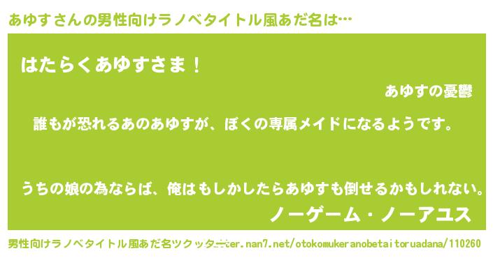 | 女子向けラノベタイトル風あだ名 | 『異世界でカフェあゆすを開店しました。』 |
