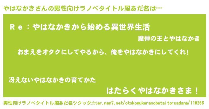 | 女子向けラノベタイトル風あだ名 | 『やはなかき夫妻のなれそめ』 |