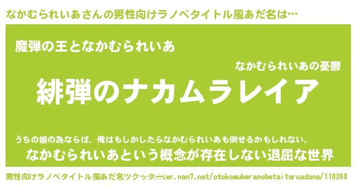 | 伝説のあだ名 | 『聞きしに勝る暗殺者なかむられいあ』 |
