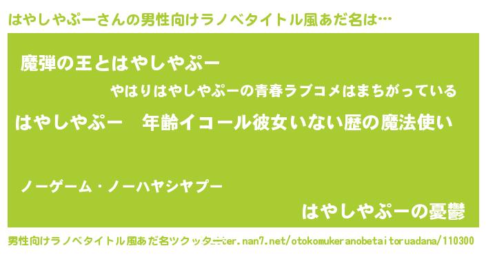 | 女子向けラノベタイトル風あだ名 | 『はやしやぷーの玉の輿計画!』 |