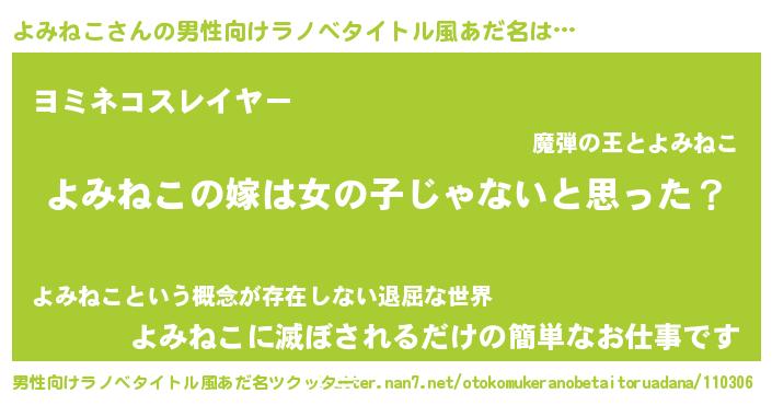 | 胡散臭い通販商品みたいなあだ名 | 『全米が絶賛したサプリメント…その名も「よみねこ」』 |