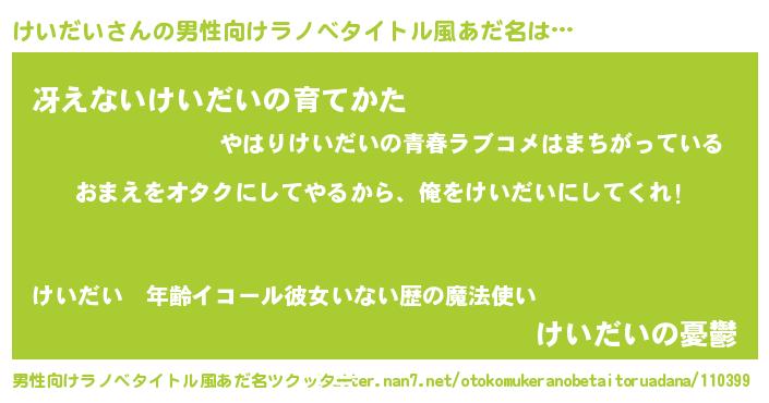| 女子向けラノベタイトル風あだ名 | 『けいだい夫妻のなれそめ』 |