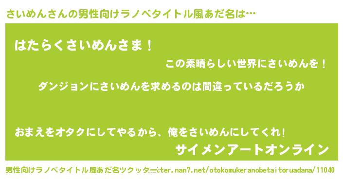 | 女子向けラノベタイトル風あだ名 | 『さいめんの卵を拾いまして』 |
