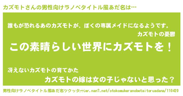 | 女子向けラノベタイトル風あだ名 | 『悪役カズモトに転生したようですが、知った事ではありません』 |