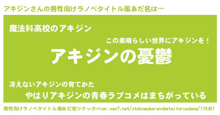 | 女子向けラノベタイトル風あだ名 | 『(仮)アキジンのやんごとなき事情』 |