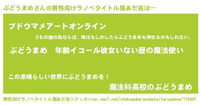 | 女子向けラノベタイトル風あだ名 | 『ぶどうまめの玉の輿計画!』 |