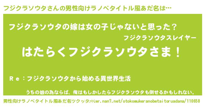 | 胡散臭い通販商品みたいなあだ名 | 『信頼と実績のサプリメント…その名も「フジクラソウタ」』 |