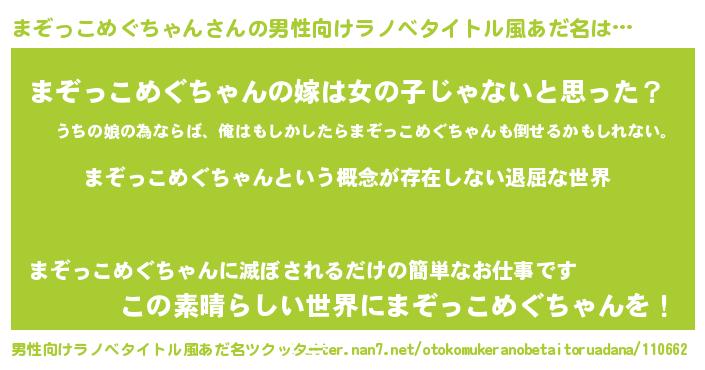 | 女子向けラノベタイトル風あだ名 | 『まぞっこめぐちゃんの契約王妃』 |