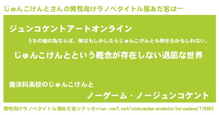 | 女子向けラノベタイトル風あだ名 | 『異世界で失敗しない100のじゅんこけんと』 |