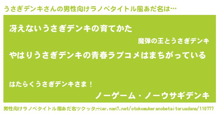 | 女子向けラノベタイトル風あだ名 | 『うさぎデンキの雑貨屋さん』 |