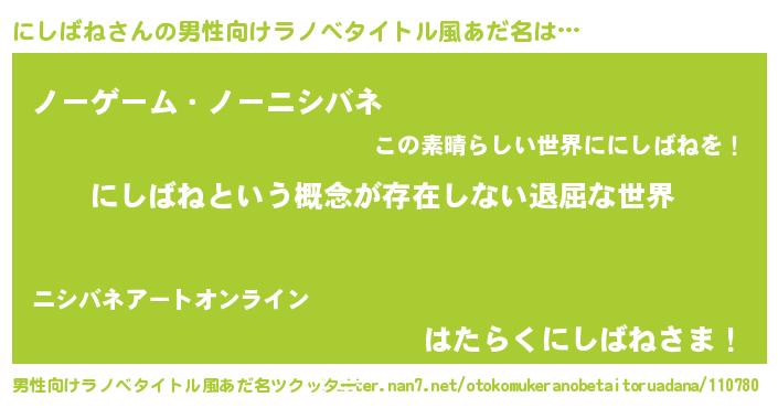 | 女子向けラノベタイトル風あだ名 | 『異世界で失敗しない100のにしばね』 |