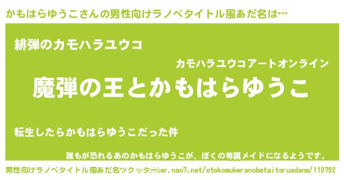 | 女子向けラノベタイトル風あだ名 | 『かもはらゆうこが死なない童話 林檎のかもはらゆうこの診療簿』 |