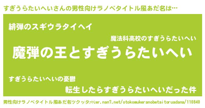 | 女子向けラノベタイトル風あだ名 | 『すぎうらたいへいが死なない童話 林檎のすぎうらたいへいの診療簿』 |