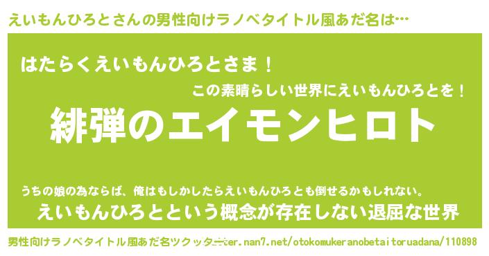 | 胡散臭い通販商品みたいなあだ名 | 『絶対に幸福をもたらす水素水…その名も「えいもんひろと」』 |