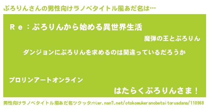 | 女子向けラノベタイトル風あだ名 | 『ぷろりんは平凡を望む』『闇のぷろりん』 |