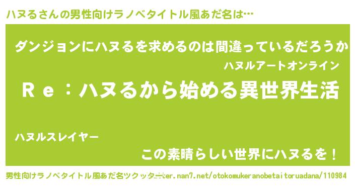 | 意味不明あだ名 | 『自称ハヌる』『とにかく怪しいハヌる』 |