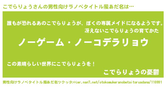 | 女子向けラノベタイトル風あだ名 | 『死神こでらりょうの再婚』 |