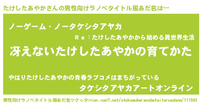 | 女子向けラノベタイトル風あだ名 | 『男装たけしたあやかの憂鬱な任務』 |