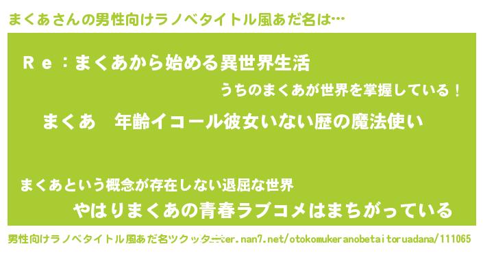 | 女子向けラノベタイトル風あだ名 | 『まくあの玉の輿計画!』 |
