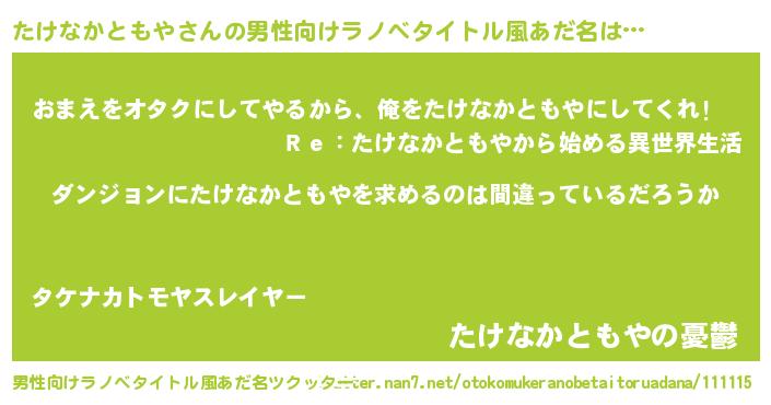 | 女子向けラノベタイトル風あだ名 | 『たけなかともやの卵を拾いまして』 |